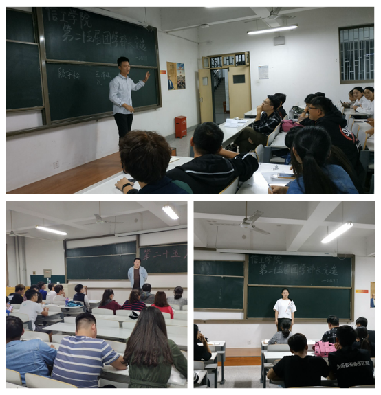本次团委学生会换届竞选,采取自我陈述和现场提问的方式进行。大会分为17日晚和18日晚两次,共有60余名同学参与各部部长、副部长的角逐。在竞选人经过自我介绍之后,行政秘书兼团委书记张娟老师、学生会副主席胡晨帆就部门工作问题向竞选人提问,主要考查干事的随机应变能力以及亲和力和管理能力。同学们的准备工作,基本上都比较充分,对部门有自己独到的理解,工作定位准确,工作思路清晰,体现出了良好的综合素质。