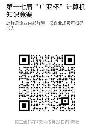 报名参赛学生企业微信扫描下面二维码,加入第十七届“广亚杯”计算机知识竞赛企业微信群,并群内填写报名表。(竞赛具体事宜,后续将在此群通知!)