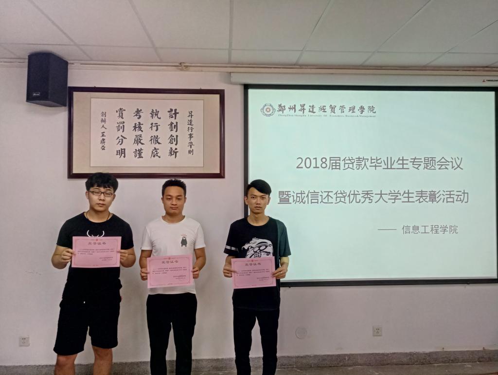 借毕业典礼学生返校时机,信工学院于6月13日12时在会议室开展2018届贷款毕业生专题会议及诚信还贷优秀大学生表彰活动,本次会议由宁珂老师主持并颁奖。