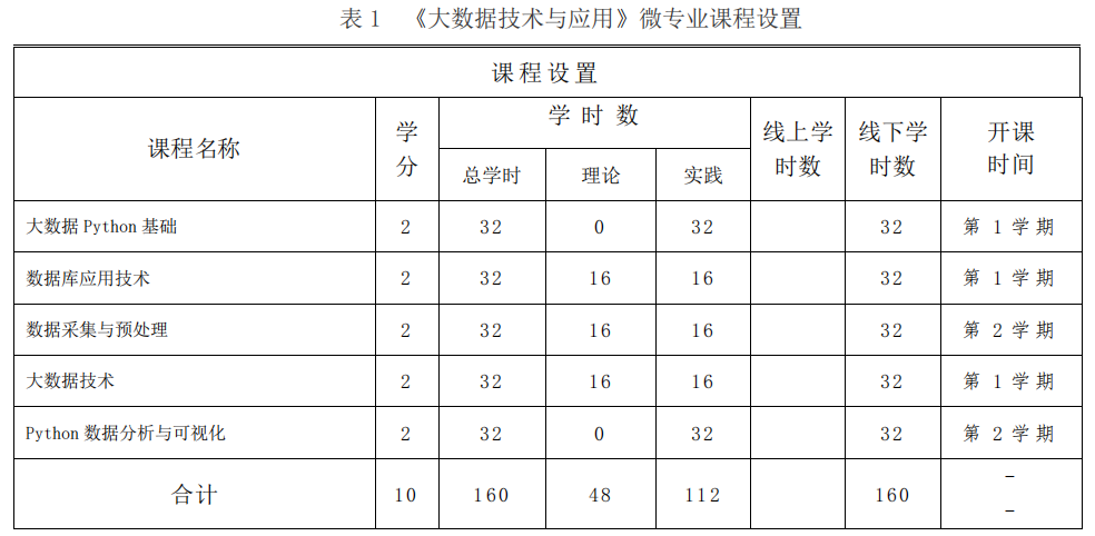 《大数据技术与应用》微专业教学时间为2个学期,课程设置如下表。