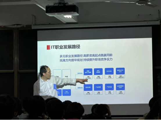 随后,王老师对未来人才市场的需求进行了分析,告诉大家,要尽早且合理地规划自己的职业生涯发展方向,要兼具理论与实战,贴合实际工作场景与应用,通过学习全面建构IT技术知识与项目管理知识体系,开拓战略视野和商业思维,掌握先进工作理念方法与沟通技巧,提升自身的综合素养,这对自己以后的就业十分有帮助。紧接着,何老师对当前的就业形势与政策进行了详细地讲解,旨在帮助同学们解决“就业难”等问题。