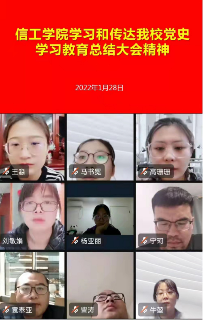 1月28日早上10点,信工学院组织召开线上钉钉会议,传达和学习我校党史学习教育总结大会会议精神。学院党委书记张现水、院长白鑫、教学秘书赵会燕、行政秘书王崇、全体党支部书记、教研室主任和辅导员老师参加了本次会议。