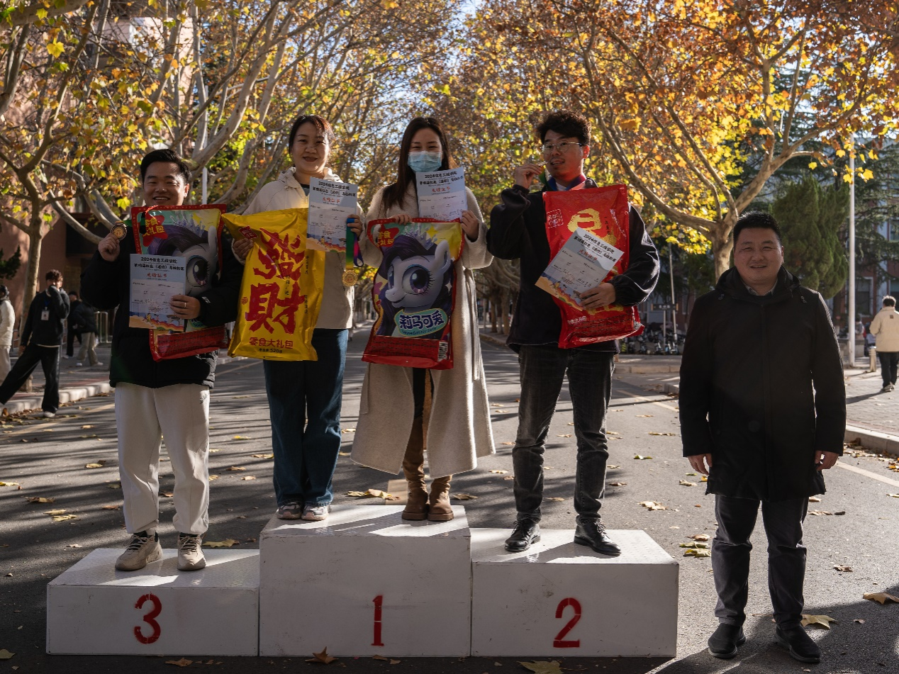 教职工组同样精彩,赵征、周媛媛老师配合默契,奔跑途中相互鼓励,凭借丰富经验与稳健体能脱颖而出,拔得头筹;朱辉星老师全力奔跑,调整节奏,不断超越自我,拿下第二名;杨玉洲老师稳扎稳打,凭借耐力优势,最终登上领奖台第三名位置,展现出教职工组的别样风采。