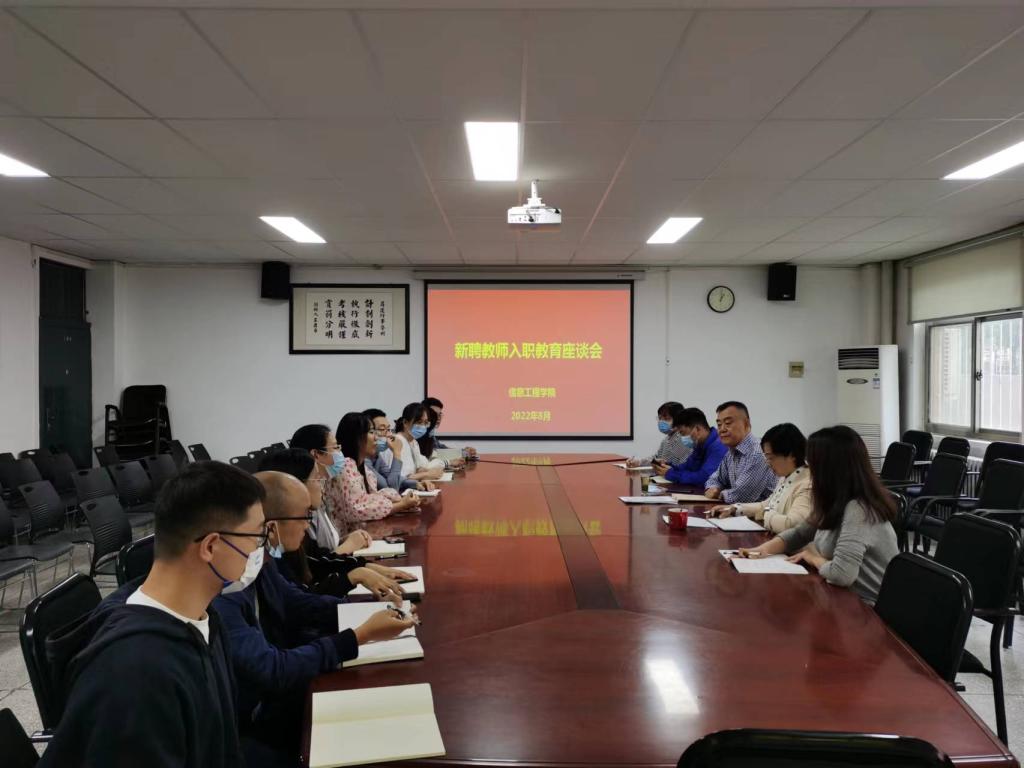 8月29日上午,信工学院召开新聘教师入职教育座谈会,学院党委书记张现水、院长白鑫、行政秘书王崇、教务秘书赵会燕、组织委员厉祎以及全体新聘教师出席会议。