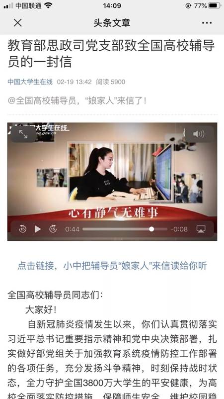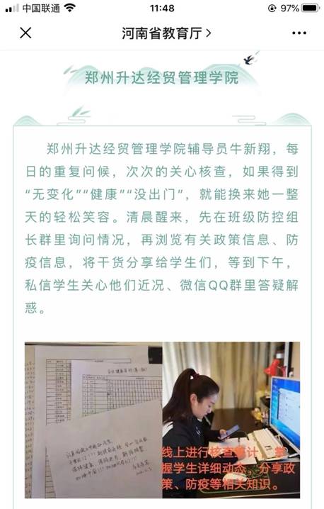 面对疫情,信工学院辅导员牛新翔始终坚守在自己的育人岗位上,她的先进事迹先后在河南省教育厅及中国大学生在线的微信公众号上宣传报道。