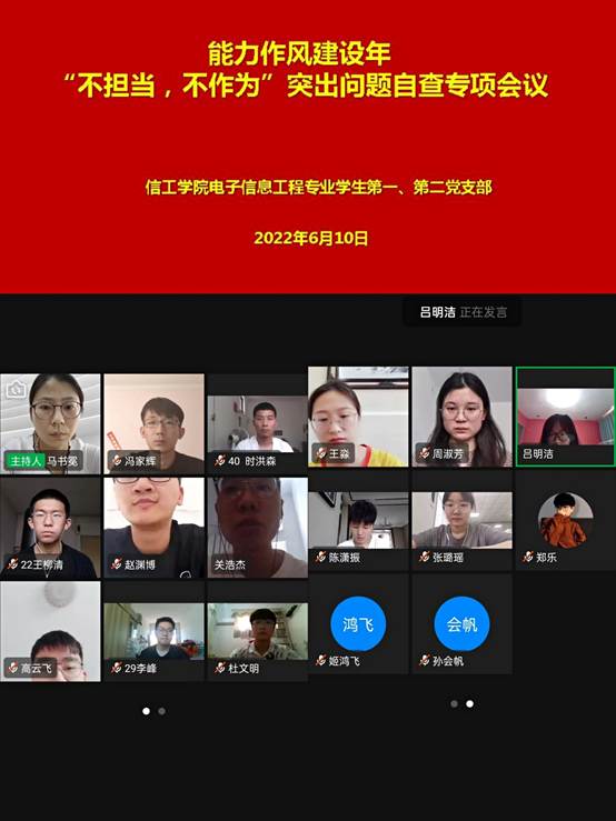 2022年6月10日中午1点,信工学院电子信息工程专业学生第一、第二党支部在钉钉会议上召开“不担当、不作为“突出问题自查专项会议,两个支部的全体党员参加了会议,会议由信工学院电子信息工程专业学生第二党支部支部书记马书冕主持。