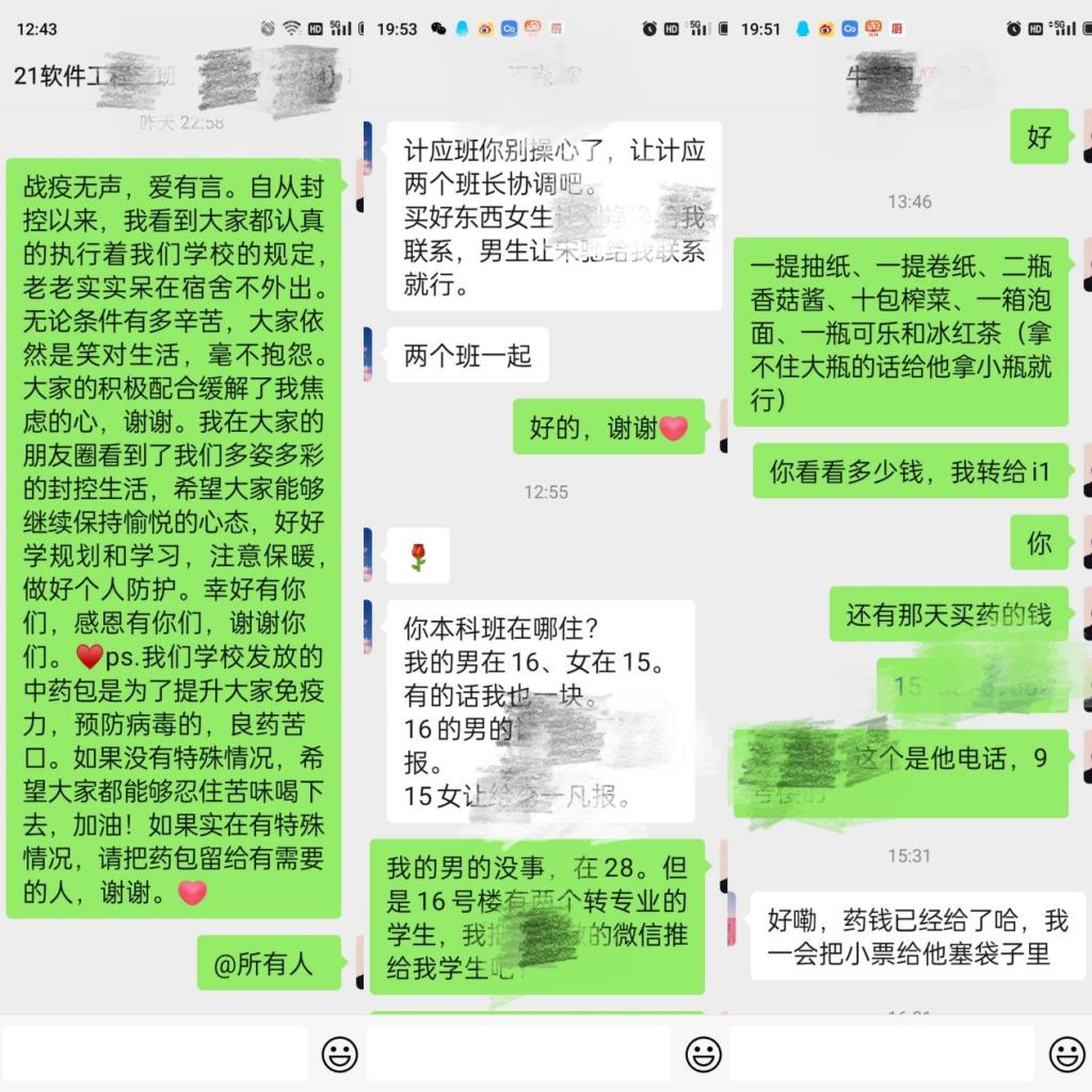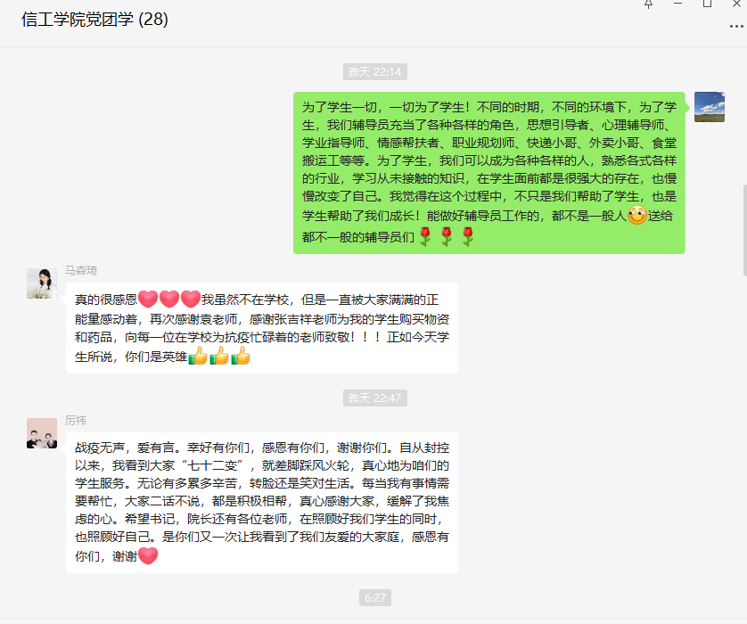 信工辅导员崔晓宁寸步不离守在生病学生身边,直至学生亲属赶到医院接续陪护,方才返校。王建红化身邻家大哥哥,不厌其烦与200多名新生分享着防疫近况。马森琦和厉祎因封控在家,但依然24小时在线,每天汇总、上报学生信息,统计学生需求,反复确认有无遗漏信息,耐心回复同学们的消息,时刻关注同学们的身心健康,提醒他们天冷加衣,照顾好自己。在同事们的帮助下,两位老师学生所需的物资也按时保量的到达了学生的手边。
