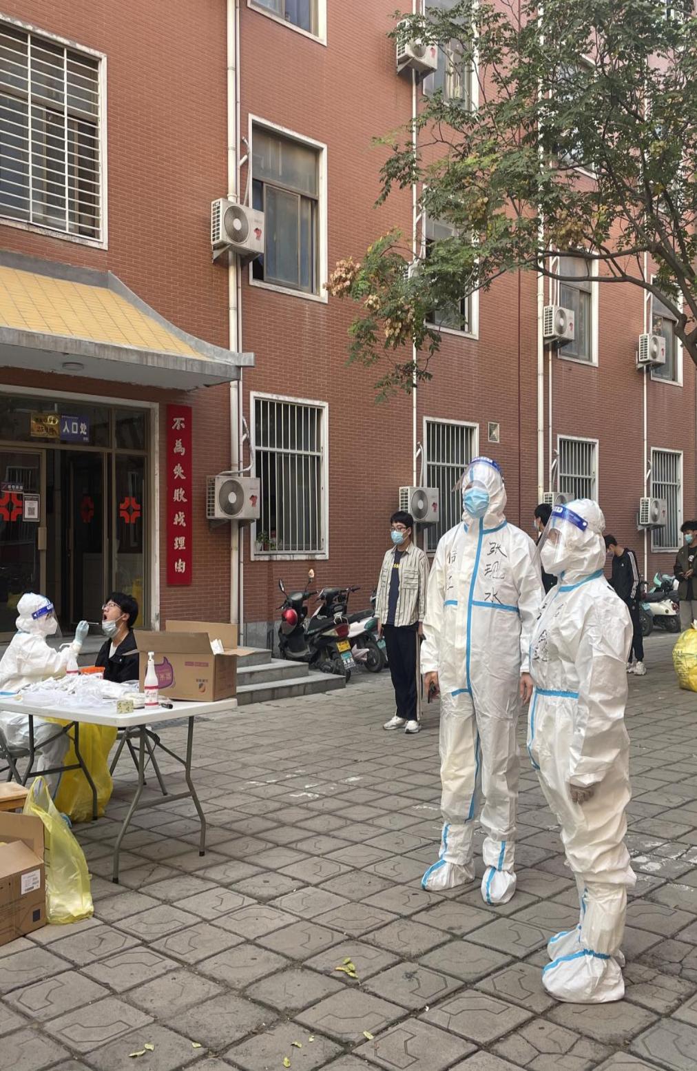 “同学们,下来做核酸了。”信工辅导员杜自平已经重复了上千次。在各宿舍楼栋,辅导员们参与了每一次核酸检测,坚定的守护在核酸检测点。头天晚上9点,各小组组长去健康中心领取学生核酸检测物资,逐一清点,搬运。第二天早上,一切准备就绪,穿上密不透风的防护服,戴好口罩和防护帽,不喝一口水,不进一口食,不断地扫码录入、贴条形码、准备采样管、叮嘱大家注意间隔……当工作忙完,还要清点核酸检测人数,看是否有遗漏,做好核酸检测员。