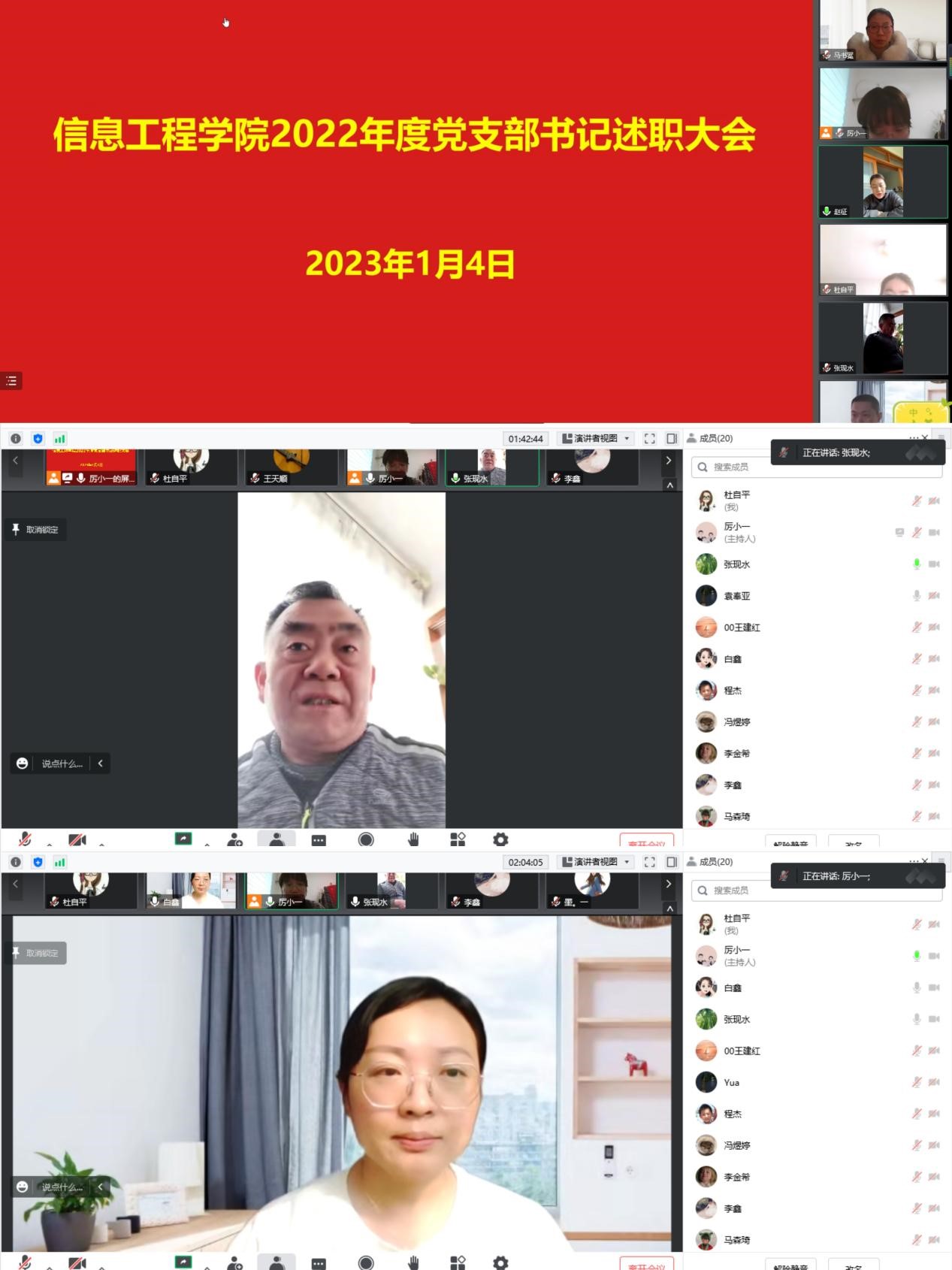 为进一步提高党建工作质量,压紧压实党支部书记抓基层党建工作职责,1月4日,信工学院召开线上2022年度党支部书记抓基层党建工作述职评议会。会议由院党委组织委员厉祎主持,院党委书记张现水,院党委副书记、院长白鑫,党委委员赵会燕、王崇和15名党支部书记参加了会议。