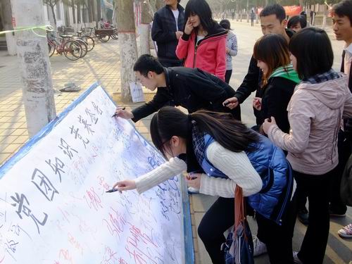 为进一步提高大学生对党团知识的认知程度,浓郁校园红色文化氛围,加强我院“党团知识竞赛”的宣传力度,3月30日下午四点,由院团委主办,资讯系、文法系、艺术系三系团委承办的主题为“弘扬党团精神,传递红色思想”的“党团知识竞赛”之全院答题——“党团知识知多少”活动及签名活动在龙湖食府门前如期举行。