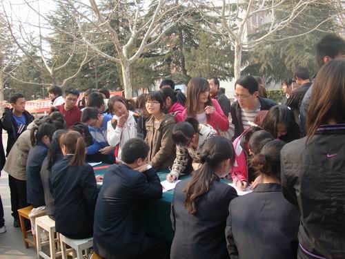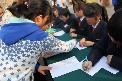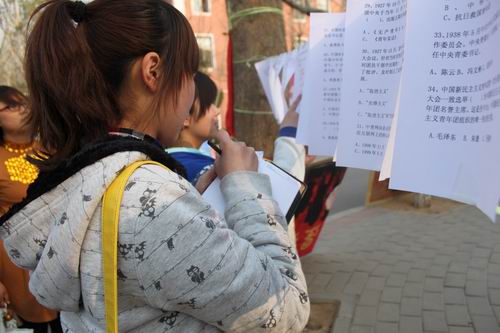 活动现场场面宏大,条幅醒目,八个系的相关工作人员身着整齐的校服,尽职尽责的为同学们服务。道路两旁的党团知识试题卡片吸引了不少同学驻足,大家纷纷选择自己知道的试题回答,并到工作人员处记录自己的答案。对于优先参加此次活动的同学,工作人员还准备了小礼品。此外,旁边的“党团知识竞赛”签名活动也进行的热火朝天,现场气氛相当活跃,同学们对这次的“党团知识竞赛”活动给予了高度的关注和支持,大家有序地在展板上签名。此次活动持续了一个多小时,整个活动现场洋溢着热烈的气氛。