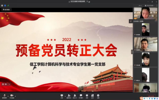 2022年12月21日,太阳成集团tyc33455ccww计算机科学与技术专业学生党支部通过在线视频会议召开转正暨预备大会。大会由计算机科学与技术专业学生第一党支部书记牛新翔同志主持,参会人员有学生党支部全体学生正式党员、预备党员以及推选发展对象。