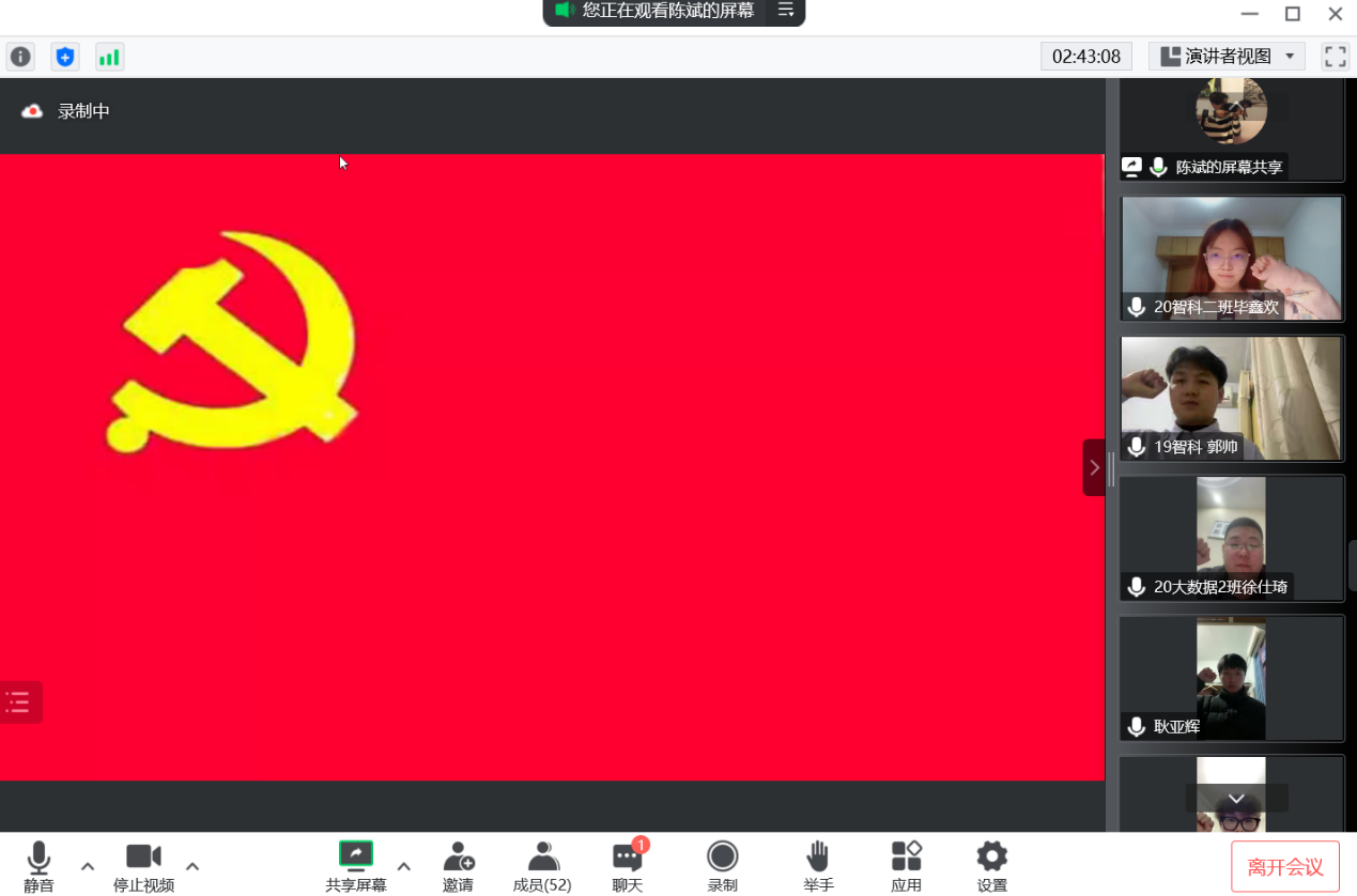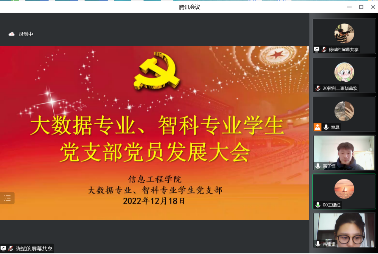2022年12月18日,太阳成集团tyc33455ccww大数据专业、智科专业学生党支部召开党员发展大会,大会的主要议题是能否接收李拓坤、高子恒、赵芳、李烜赫、徐仕琦、陈斌、权娜娜、任世博、胡艺蔓、李晨宇、王梦景、袁浩一、阴梦豪、尚永艳、郭帅、冯晶晶共16名发展对象为中共预备党员的讨论和表决。本次会议采用视频会议形式进行,支部正式党员、预备党员和部分发展对象出席本次会议,会议由支部书记王建红同志主持。