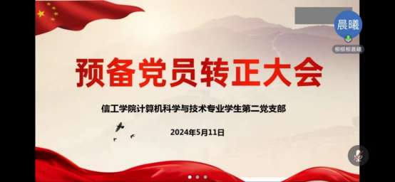 2024年5月11日下午,信工学院计算机科学与技术专业学生第二党支部召开线上预备党员转正大会,本次会议由支部组织委员柳晨曦主持,支部全体党员参加。