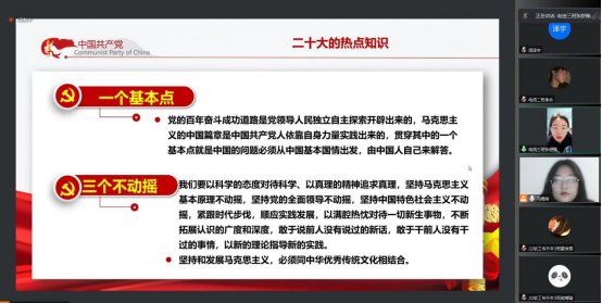 大会内容主要分为两大部分:重温二十大热点知识,并由支部成员现场对党的二十大精神进行深入解读,同时在冯煜婷老师的带领下同各党员同志进行指正和补充;听取党员同志对近期的思想以及日常生活情况的汇报,并结合实际给予指正。