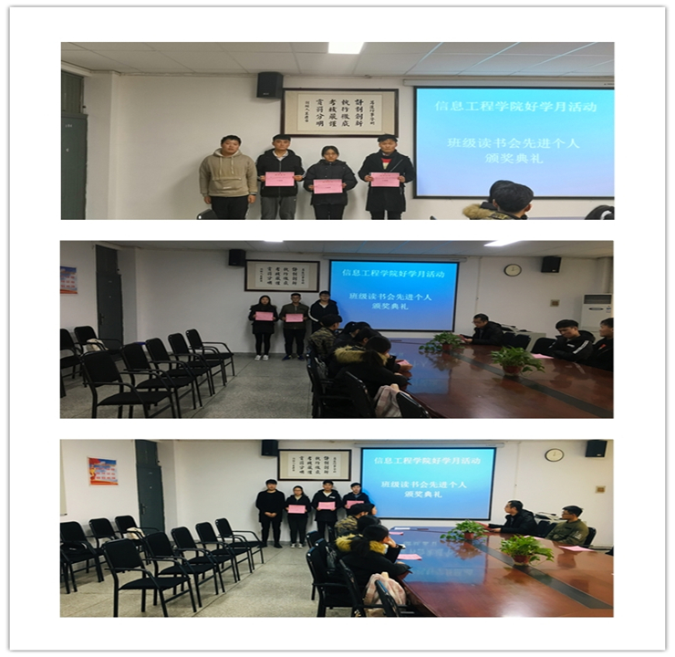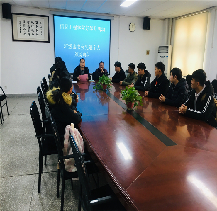 腹有诗书气自华,读书万卷始通神。为共建升达优良学风,促进我院学风建设,增强全院学生学习的积极性和主动性。12月26日中午12点,信工学院于资讯楼104会议室举行“好学月”活动之班级读书会先进个人颁奖仪式。团委常务副书记袁奉亚老师、18级辅导员王建红老师、团委副书记左金磊、学生会副主席常向凯和学术部部长楚金虎出席了本次仪式。