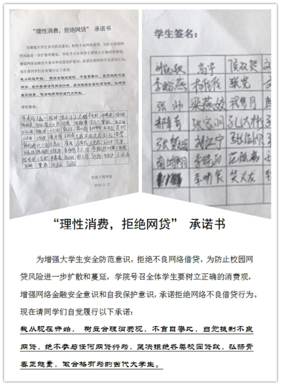 会上,各班辅导员及负责人从校园网络(套路)贷款特点、存在的主要风险和危害等方面展开讲解,剖析实际鲜活案例,引导学生树立正确的消费观念和财产安全观念,增强学生对校园网贷风险的理解和认识。同时针对超前消费、过度消费和从众消费等问题,主讲人提醒同学们要培养勤俭节约意识,建立起健康积极的财富观,学会提高对不良网贷的甄别抵制能力,同时注重保护好隐私信息,做好防范个人财务风险的准备。接着,各班签订“理性消费拒绝网贷承诺书”。