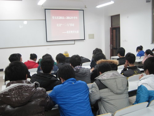 为了纪念“一二•九”运动76周年,继承和发扬革命先烈的精神,12月7日晚上6:30,资讯系团委在道镕楼202室举办了观看爱国影片活动,我系各班学生代表一同观看了电影《东风雨》。