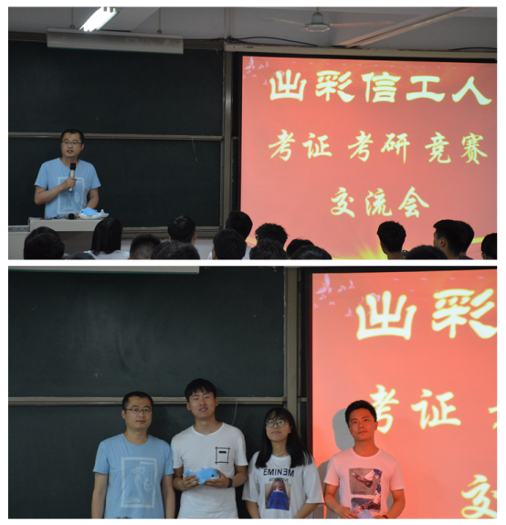 为鼓励我院学生考研、考证、参与竞赛,信工学院特于2019年6月4日晚上7点在资讯楼415举行出彩信工人之考研、考证、竞赛交流会。信工学院团委常务副书记袁奉亚老师出席了本次交流会。信工学院秦苗苗、刘静轩等优秀毕业学生参与了本次交流会。