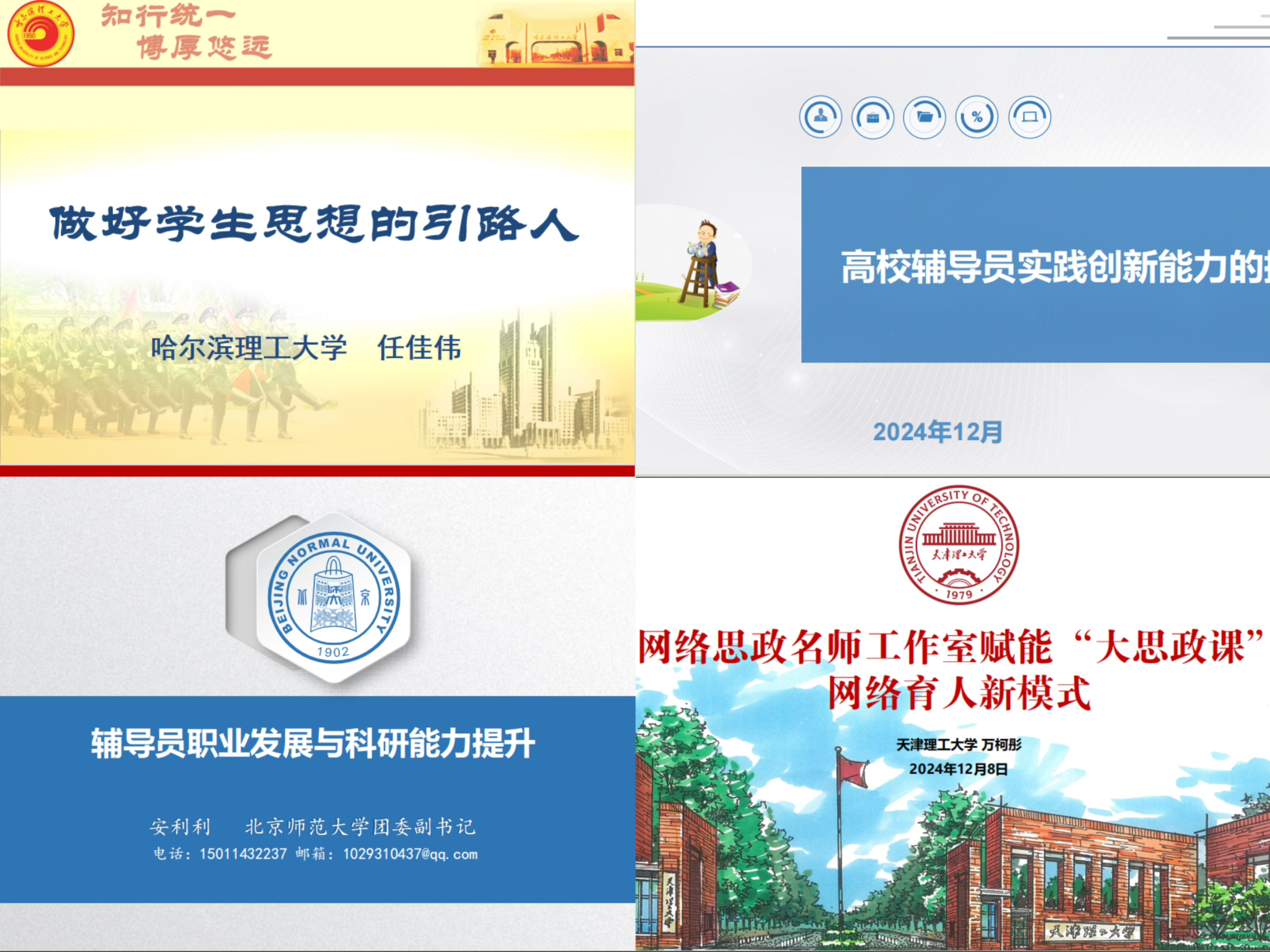 本次培训邀请了哈尔滨理工大学任佳伟老师以“做好学生思想的引路人”为题的报告开局,生动介绍了其在做辅导员工作期间的感悟和方法;邀请了教育部学习宣传“党的十九大精神”和“党的二十大精神”全国报告团成员;辽宁大学辅导员刘巍老师对高校辅导员实践创新能力的提升进行了分享,北京师范大学团委副书记安利利老师分享了辅导员职业发展与科研能力提升的报告;天津理工大学万柯彤老师以网络思政名师工作室赋能“大思政课”网络育人新模式为题做了详细的分享。