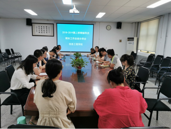 2019年7月5日上午8点30分,信工学院在资讯楼104会议室召开2018-2019学年第二学期辅导员工作总结分享会。信工学院党总支王新平书记、行政秘书兼团委书记张娟老师以及全体辅导员老师参加了本次会议,会议由行政秘书张娟老师主持。