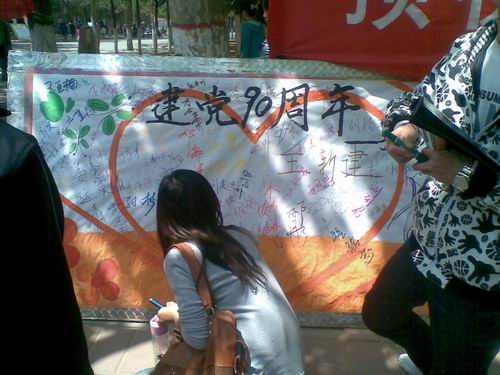 庆祝建党九十周年是资讯系政治生活的一件大事,我系党政领导给予了高度重视,指导开展了一系列的活动。为了让广大青年铭记党的光辉历程,激发同学们的爱国热情,5月4日中午,我系在龙湖食府门前举行了庆祝建党九十周年系列活动之——“创辉煌 表决心”签名活动,广大师生积极参加了此次活动。