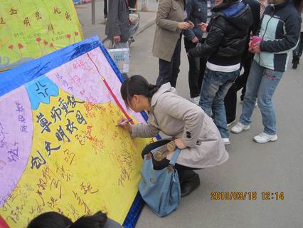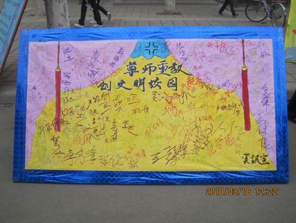教师是知识的源泉,是人类灵魂的工程师,是我们前途与命运的承载者,尊重老师,就是尊重知识,尊重文明,尊重我们自己,尊重国家的未来。为了响应学院创建文明校园的号召,3月18日中午,我系团委社团联合部在龙湖食府门前举行了“尊师重教创建文明校园”大型的签名活动,反响强烈。