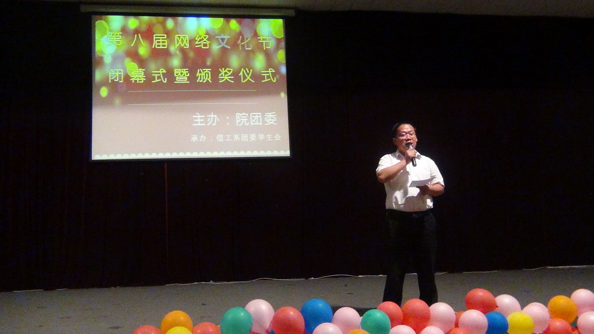 5月26日晚七点,龙湖报告厅灯火通明,璀璨别致,由院团委主办、信工系团委承办的第八届“网络文化节”颁奖晚会在此隆重举行。出席晚会的领导嘉宾有院团委王红晓书记,信工系主任李学桥教授、信工系党总支魏民书记、信工系党总支王新平副书记、会计系行政秘书兼团委书记陈刚老师、营销系行政秘书兼团委书记郭峰老师、信工系行政秘书兼团委书记张娟老师,信工系13级团总支书记厉祎老师、辅导员崔晓宁老师以及院系团学干部、获奖选手和观众共500余人。