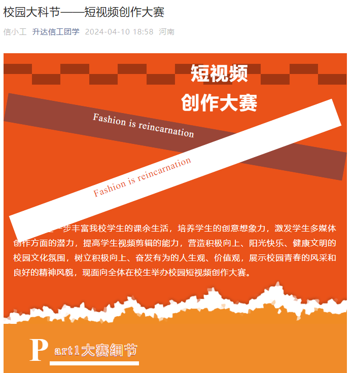 为了进一步丰富我校学生的课余生活,培养学生的创意思维和想象力,激发学生多媒体创作方面的潜力,提高学生视频剪辑能力,营造积极向上、阳光快乐、健康文明的校园文化氛围,展示校园青春风采和良好的精神风貌,2024年4月11日至4月25日,由校团委主办,信工学院承办,校青媒协办的短视频创作大赛顺利举办,此次参赛对象面向全体在校生。