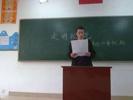 我系要求所有学生:做文明人,规范我们的言行,做到明礼诚信,做一个有利于社会的人,一个有利于学校的人,一个有利于班级的人,一个有利于自我健康发展的人。 在现代社会生活中,文明礼貌不仅给社会、给他人带来和谐愉快,也能给自己带来快乐,带来温馨。讲文明礼貌表面上是个人的小事小节,其实是一个民族的大事。在一个“礼仪之邦”的国家,我们有责任和义务充当文明礼貌的使者。让我们从我做起,从现在做起,从小事做起,让文明礼貌的春风吹拂着校园的每一个角落,让我们生活在一个文明、温馨、整洁、和谐的校园大家庭中。(供稿人:曹丹丹) |