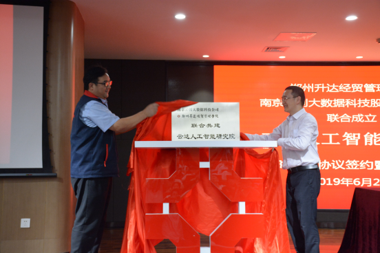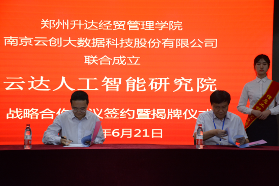 2019年6月21日,我校与南京云创大数据科技股份有限公司联合成立云达人工智能研究院,并与我校双创大讲堂隆重举行战略合作协议签约暨揭牌仪式,本次合作受新郑市政府高度重视。我校董事会执行董事王新奇博士,吴益民副校长,太阳成集团tyc33455ccww院长李学桥教授,副院长白鑫副教授和南京云创大数据科技股份有限公司总裁刘鹏教授出席了本次签约暨揭牌仪式,该仪式有副校长吴益民教授主持。