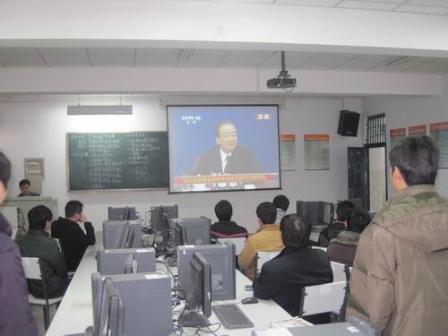 3月14日上午10时,资讯系党总支组织没有课的老师和学生党员在资讯楼514观看《温家宝总理答中外记者问》。