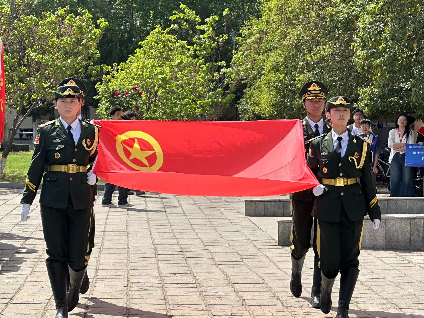 第三项是奏团歌、出团旗;国旗班同学迈着坚定的步伐,护送着团旗向主席台走来。他们身姿挺拔,精神饱满,展现了新时代青年的风采,是我们学习的榜样。