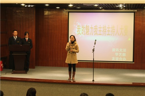 为进一步推进校园文化建设,加强大学生素质教育,促进大学生全面发展,11月17日晚,由资讯系和文法系联合举办的主持人大赛决赛在外语楼一楼多功能报告厅隆重举行。出席比赛的嘉宾有资讯系行政秘书兼团委书记陈刚老师,文法系行政秘书兼团委书记郑玲玲老师,文法系2011级年级团总支书记、辅导员刘玉梅老师,资讯系2011级年级团总支书记、辅导员袁保华老师以及院学生会主席许春亚、院学艺部长李真、院学艺部副部长相海霖、外语系团委副书记张泽宇、营销系学生会主席张鎏奇、国贸系学艺部部长刘文杰、营销系学艺部部长张鑫等,两系2011级的学生也到场观看了本次比赛。