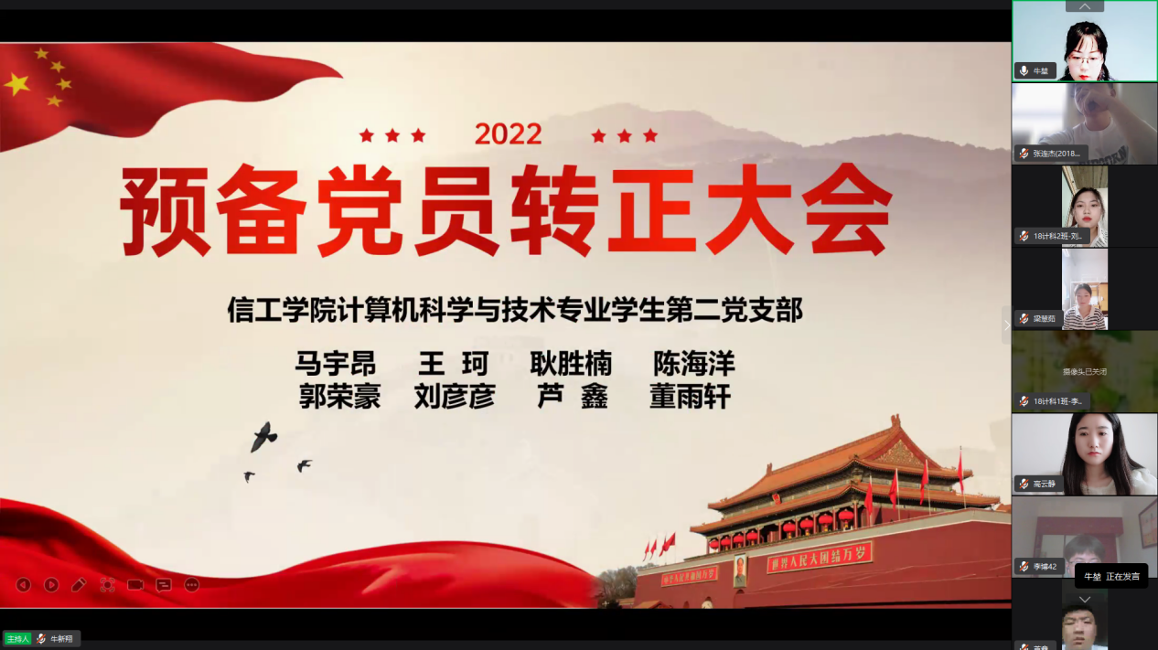 2022年6月3号,我院计算机科学与技术专业学生第二党支部召开支部预备党员转正暨发展大会。大会由我院计算机科学与技术专业学生第二党支部书记牛堃老师主持,参会人员有学生党支部全体学生正式党员、预备党员及发展对象。