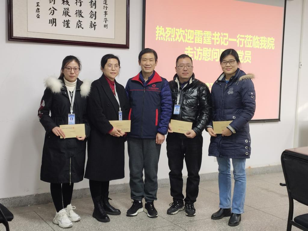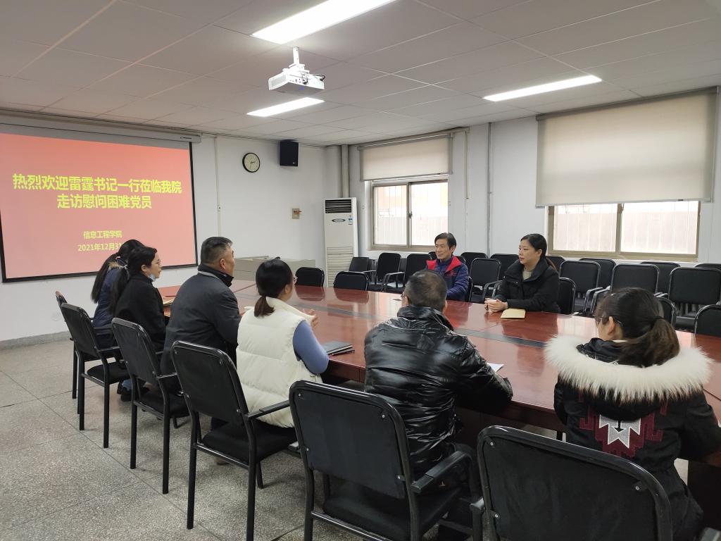 2021年12月31日,我校党委书记雷霆和校党委办公室主任秦旻莅临太阳成集团tyc33455ccww,走访慰问困难党员,向我院教师党员李艳萍和史丽丽,学生党员牛啸天和张鼎送来了组织的关怀与温暖。我院党委书记张现水、院长白鑫、教学秘书赵会燕、李艳萍老师和史丽丽老师,牛啸天的辅导员王建红老师和张鼎的辅导员马书冕老师参加了此次活动。