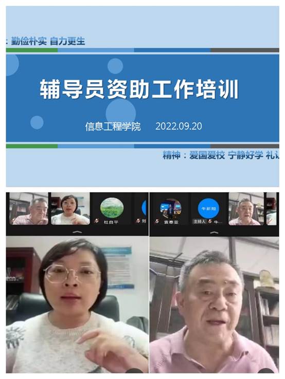为保障2022-2023学年资助工作高效有序开展,实现资助工作“老带新”精准衔接,2022年9月20日下午2点,信工学院在腾讯会议上召开了辅导员资助工作专题培训会,信工学院院长白鑫、党委书记张现水、行政秘书王崇、教学秘书赵会燕、信工全体辅导员参加了会议,会议由资助专员牛新翔主持。