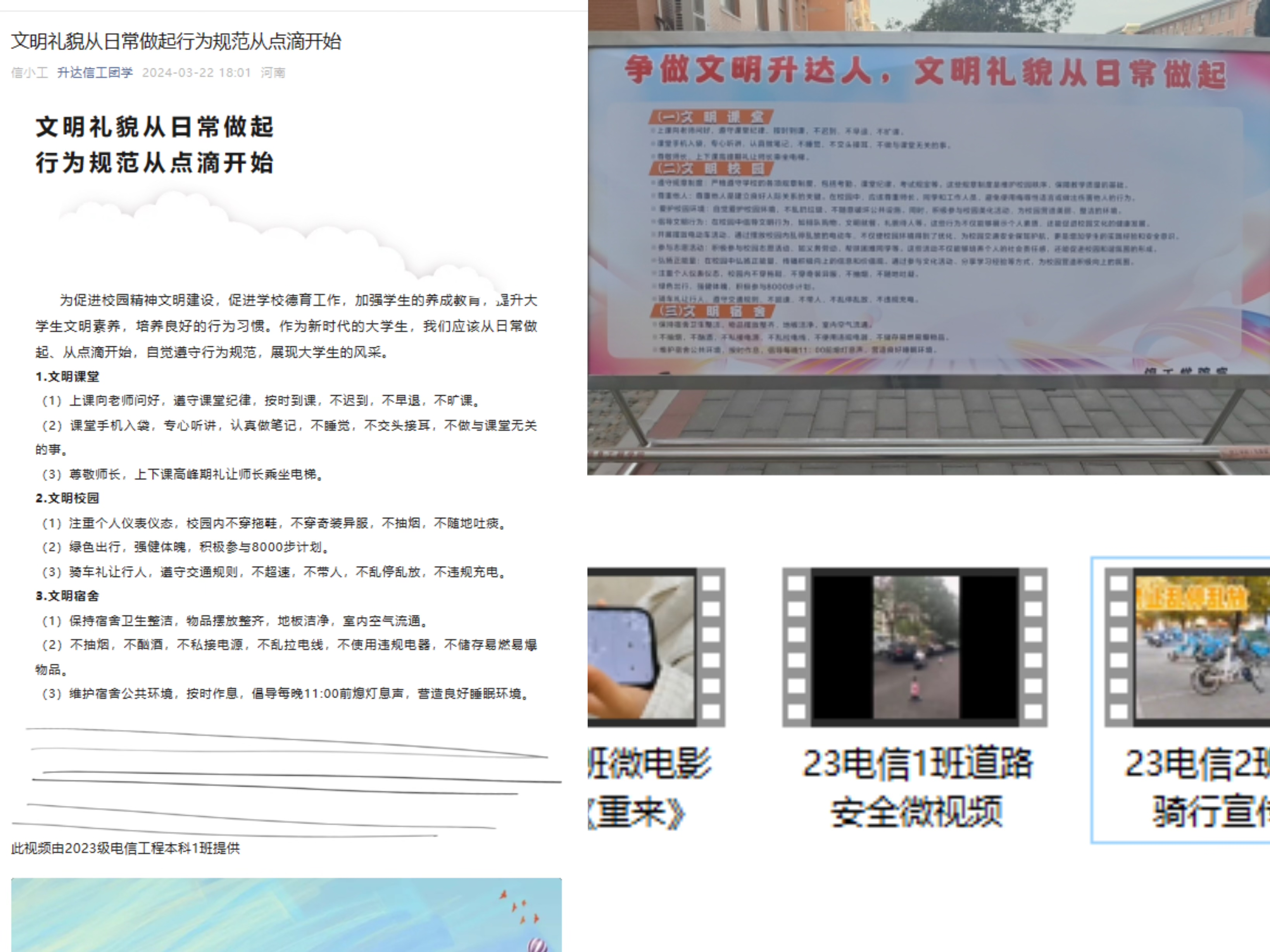 首先,信工学院利用展板、学院公众号,宣传文明礼貌月相关活动内容。让学生耳濡目染,形成良好学习、生活好习惯。其次,结合各班级特点和此次活动主题,采用学生感兴趣动员学生发挥创意、多角度的拍摄、制作文明礼貌月相关视频。让学生真正参与其中,并深刻认识到文明礼貌的重要性,逐渐形成“人人文明、班班新风”的学院氛围,共创文明和谐信工。