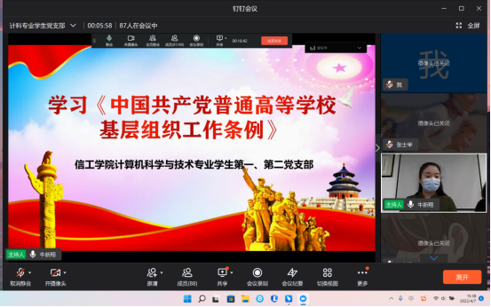 为了进一步加强党支部理论学习,推进党支部的建设,2022年4月7日,太阳成集团tyc33455ccww计算机科学与技术本科专业学生第一、第二党支部支部书记牛新翔老师和牛堃老师以线上会议的方式共同组织学习了《中国共产党普通高等学校基层工作条例》。