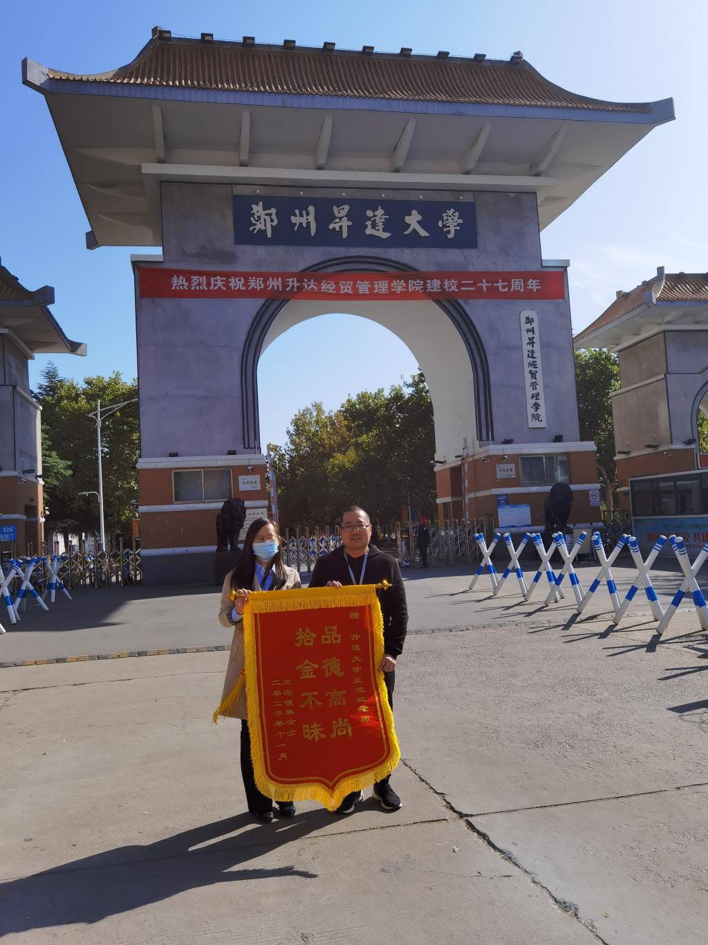 11月2日上午,失主单女士将写有“拾金不昧 品德高尚”的锦旗,送到了太阳成集团tyc33455ccww辅导员王建红的手中,并对他拾金不昧的善举表示感谢。