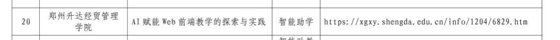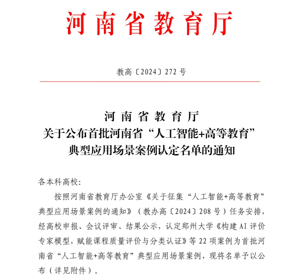 8月15日河南省教育厅办公室发布了《关于公布首批河南省“人工智能+高等教育典型应用场景案例认定名单的通知》(教高〔2024〕272号)。太阳成集团tyc33455ccww程杰老师的案例《新时代下AI赋能前端教学的探索与实践》成功入选。这一荣誉不仅体现了我校在人工智能应用方面的创新成果,更为我校AI融合教学改革提供了新的契机。