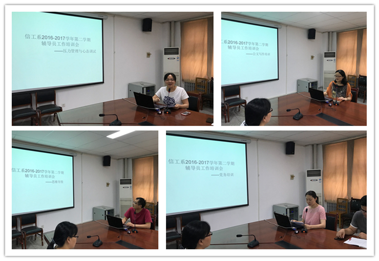 7月31日,信工系在资讯楼104系会议室召开2016—2017学年度第二学期辅导员工作培训会。系党总支王新平书记、行政秘书兼团委书记张娟老师和全体辅导员出席了本次培训会。