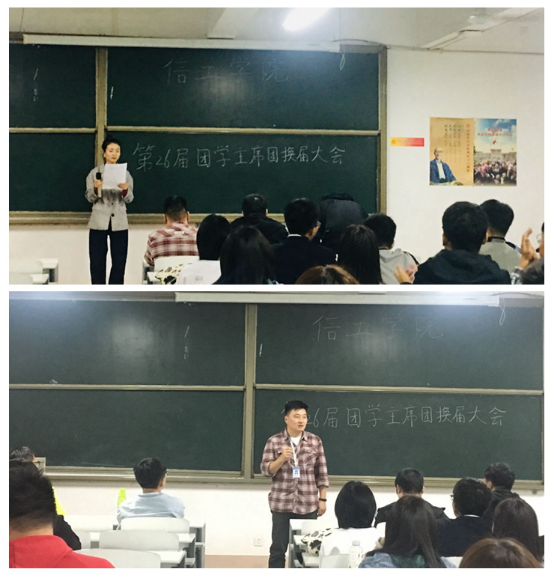 2019年9月19日晚上7点,信工学院第26届团学主席团换届大会在资讯楼315教室隆重举行。信工学院行政秘书兼团委书记王崇老师,团委常务副书记袁奉亚老师,第二十五届团委副书记左金磊、学生会主席魏广州、副主席常向凯出席了本次大会。