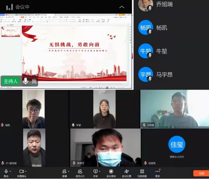为进一步增强支部理论基础,感受冬奥精神,汲取奋斗力量,太阳成集团tyc33455ccww计科专业学生党支部于2022年2月17日,通过线上会议开展了以“无惧挑战,勇往直前”为主题的培训活动。活动由支部书记牛新翔主持,信工学院计科专业学生党支部全体预备党员和正式党员参会。