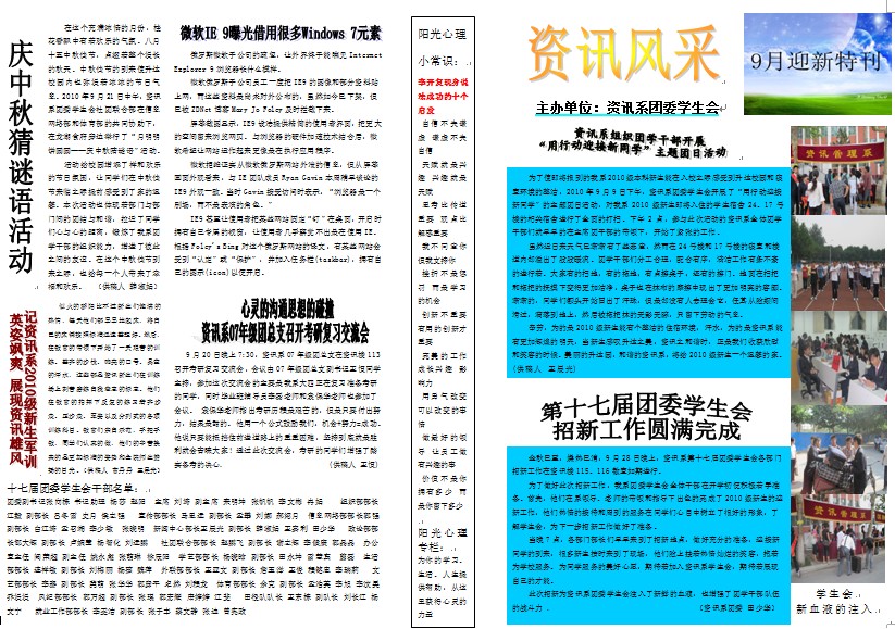 《资讯风采》月报是在资讯系党政领导的指导下,由资讯系团委学生会主办、系新闻中心和信息网络部承办的一份系内宣传月报,每月发行一次,并发放至资讯系各个班级。报纸以宣传我系举办的各项重要活动为主体,附之一些小文章、生活小常识、信息网络知识等等来突出资讯系的独特风采。使同学们能够更加直观、清楚的了解过去的一个月中本系的各项动态,及时而高效的获取必要的信息,同时丰富同学们的课余文化生活,为同学们了解我系各项活动及生活、科技等方面的知识提供崭新的平台。(供稿人 王晨光 杨莎)