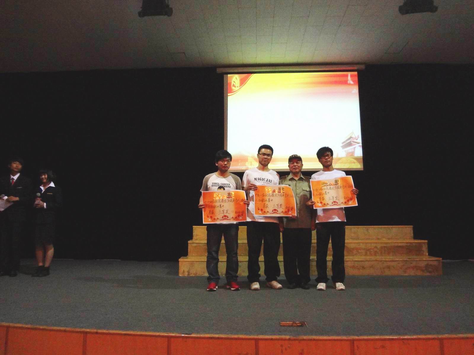 比赛结束,各项奖项也都花落各家。荣获组织奖的是11电信2班,荣获三等奖的是09计科班,10电信1班,09电信1班,二等奖的是11电信1班,11计升本1班,荣获一等奖的是11计升本2班。与会的领导和嘉宾为其颁奖并合影留念。