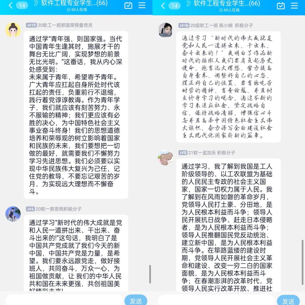10月16日以来,党的二十大报告在信工学院软件工程专业学生第一党支部引起了强烈反响,我支部开展学“金句”、悟原理、谈感悟分享活动。