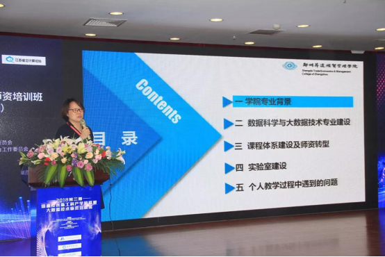 在此次培训中,我们与来自北京、重庆、江苏、安徽、河南、山西、山东、湖北、辽宁、贵州、广东等多个地市的高校教师齐聚金陵,聆听学习专业的高校大数据师资培训课程,以期提高大数据技术教学改革与创新的业务水平和能力,促进中国大数据人才的培养。在3天的培训日程中,我们聆听了来自南京大数据研究院、金陵科技学院、南京信息工程大学、南京林业大学、南京云创大数据科技股份有限公司等大数据领域的多位课程专家和技术专家授业解惑,进一步学习了数据挖掘、数据可视化、生物大数据、交通大数据等专业知识。在培训中,我们同其他高校探讨了数据科学与大数据技术专业建设情况,我院周湘贞老师,也在现场分享了我院的数据科学与大数据技术专业建设实况,特别是课程体系建设及师资转型、实验室建设等,给现场老师提供了实在的专业建设模板。