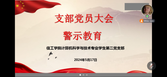 为了推进党纪学习教育走深走实,提高党员师生的纪律意识,5月17日,计算机科学与技术专业学生第二党支部于线上召开警示教育专题会议。会议由支部书记李金希主持,支部全体党员参加。