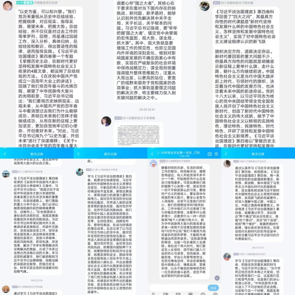 此次学习形式不同以往,先由学生代表学习归纳后,将学习资料和笔记分享给支部成员,并领学了部分内容,在学习活动开展后,党支部成员也在支部群内进行了热烈的讨论,对《习近平谈治国理政》第四卷中的科学回答“四大之问”、《实现中华民族伟大复兴必须坚持斗争精神》、“十个明确”等相关内容有了深刻的认识,并针对学习内容积极踊跃发表学习感想与个人体会。